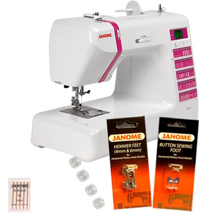 Free With Purchase! Janome Accessories $48.98 Value! Including:Hemmer Foot Set ($24.99 Value), Button Sewing Foot (17.99), 4 Bobbins ($2.00 Value), Universal Assortment Needles 5 pack($4.00 value)